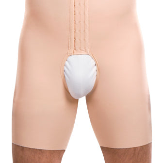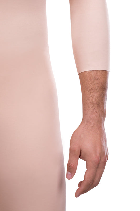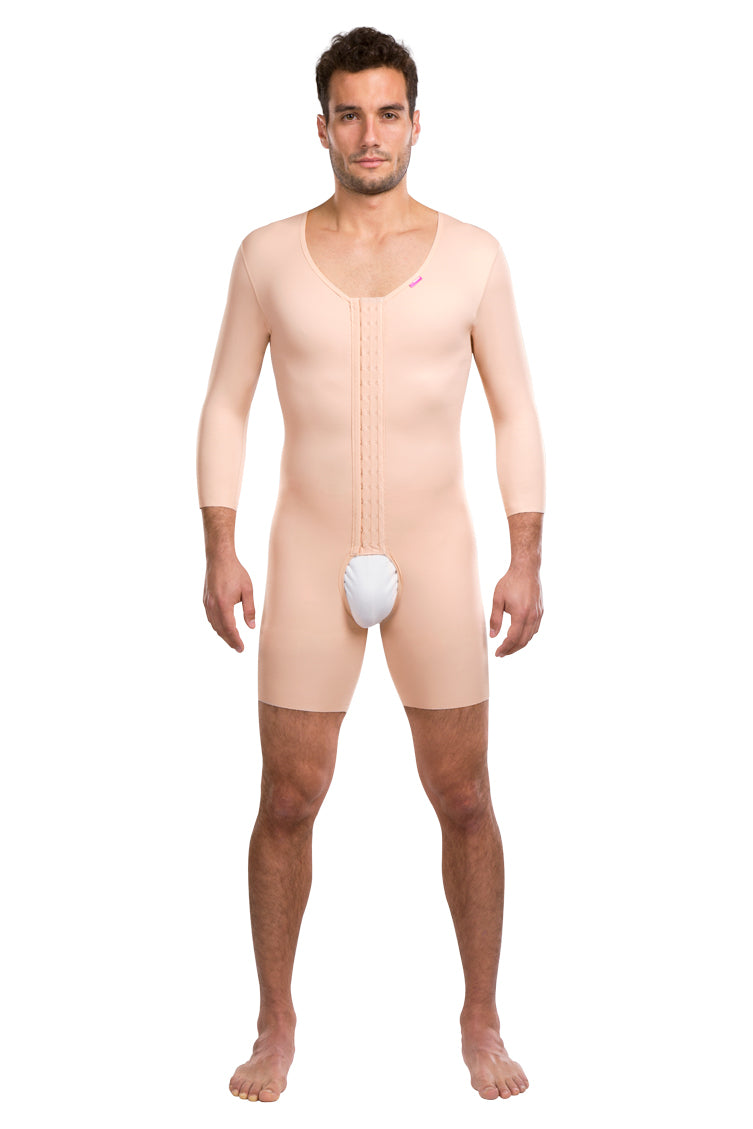 - Male post-operative garment with ¾ sleeves and trousers for comfortable wearing after brachioplasty, abdominoplasty and liposuction.